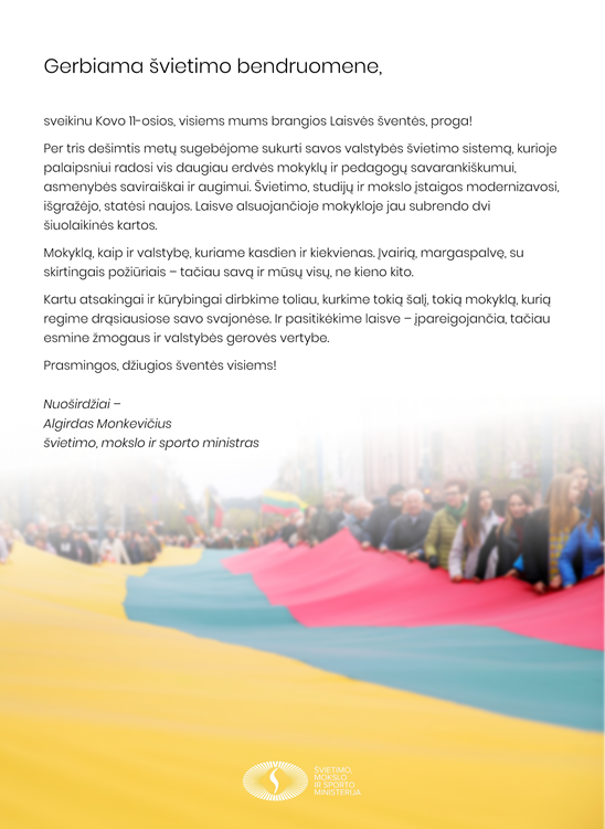 Švietimo, mokslo ir sporto ministro Algirdo Monkevičiaus sveikinimas Kovo 11-osios proga