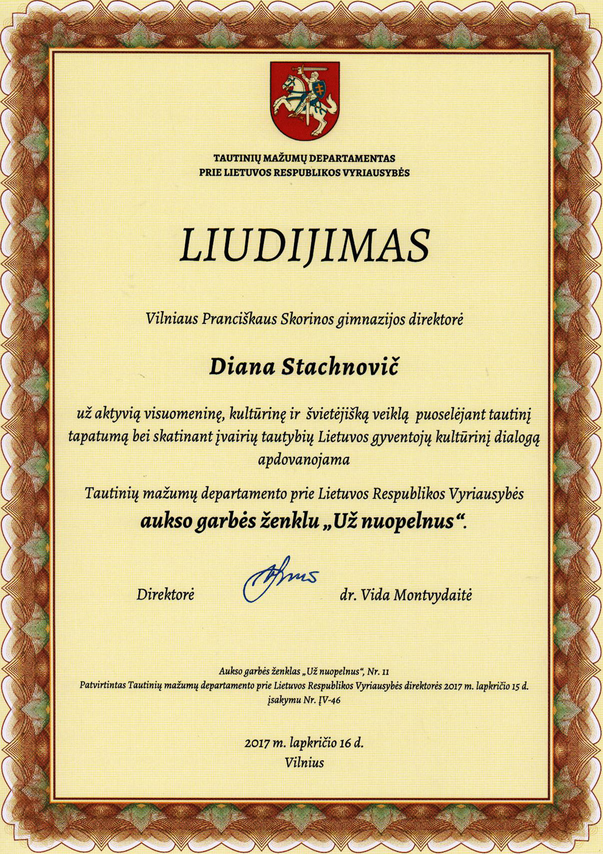Lapkričio 16 d., minint Tarptautinę tolerancijos dieną, Lietuvos Respublikos Seime pagerbti labiausiai prie daugiatautės Lietuvos vienijimo prisidėję žmonės ir institucijos. Gimnazijos direktorei Dianai Stachnovič Tautinių mažumų departamento prie Lietuvos Respublikos Vyriausybės direktorė Vida Montvydaitė įteikė garbingą apdovanojimą - Aukso Garbės ženklą „Už nuopelnus”. Gimnazijos bendruomenė nuoširdžiai sveikina ir džiaugiasi šiuo direktorės apdovanojimu bei linki naujų pasiekimų toliau puoselėjant tautinį tapatumą, skatinant įvairių tautybių Lietuvos gyventojų kultūrinį dialogą.