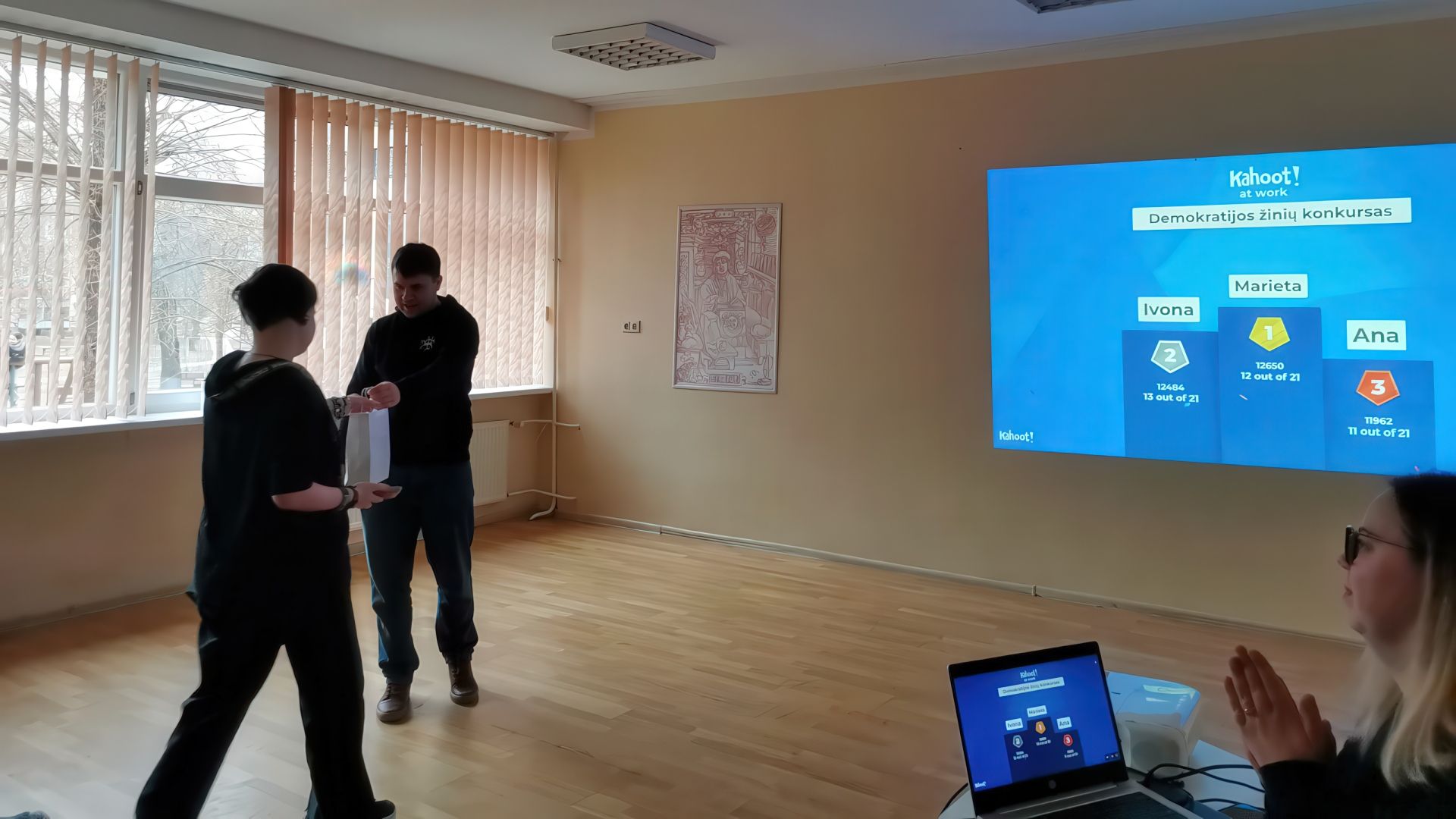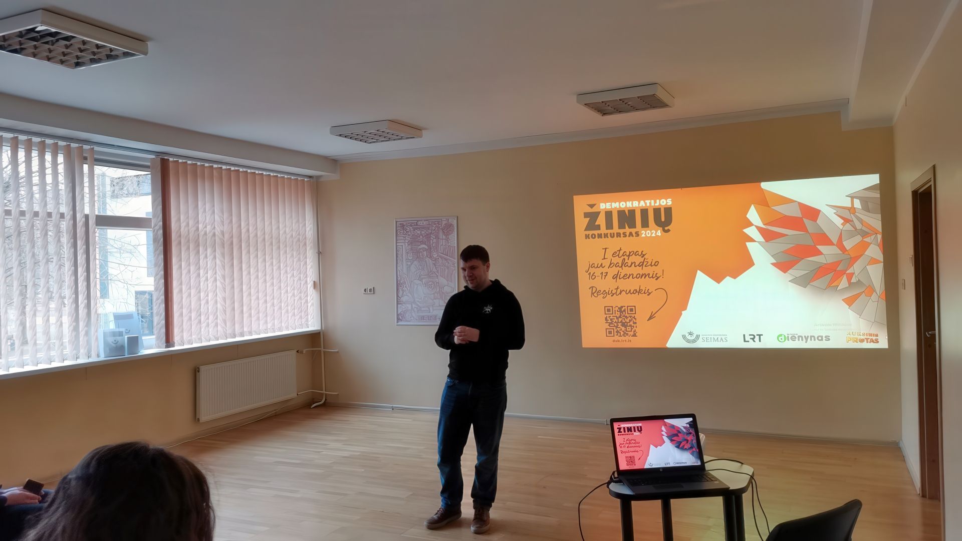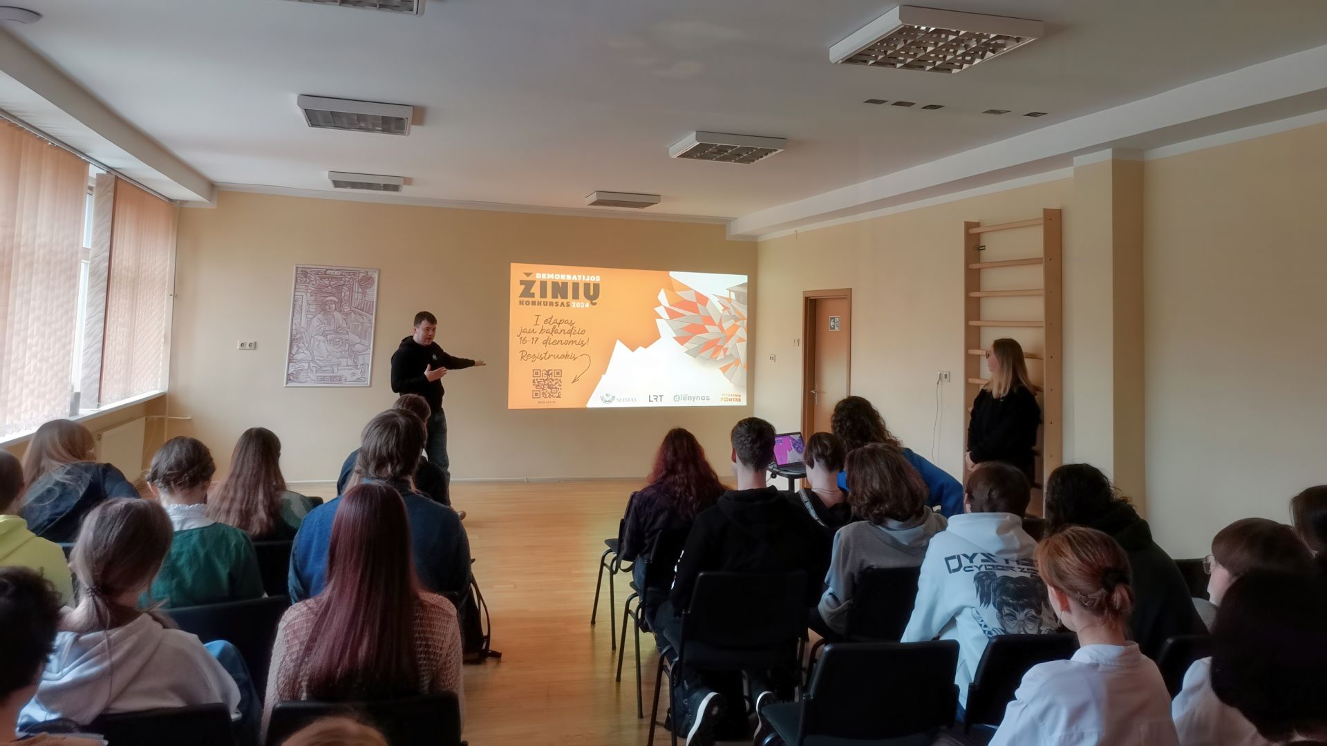 Š.m. kovo 19 d. gimnazijoje vyko interaktyvi pamoka, skirta demokratijos žinių konkurso pristatymui. Pamoką vedė ir su II-IV g klasių mokiniais bendravo Lietuvos Respublikos Seimo kanceliarijos Informacijos ir komunikacijos departamento specialistai Giedrius ir Gailė. Svečiai supažindino su konkurso tikslais, dalyvavimo jame sąlygomis, organizavo Kahoot viktoriną. Geriausiai ir greičiausiai į klausimus atsakiusiems mokiniams buvo įteiktos dovanėlės. Tikimės, kad šis susitikimas paskatins I-IV g klasių mokinius balandžio 16 d. dalyvauti demokratijos žinių konkurse ir pasitikrinti pilietinio raštingumo žinias.
