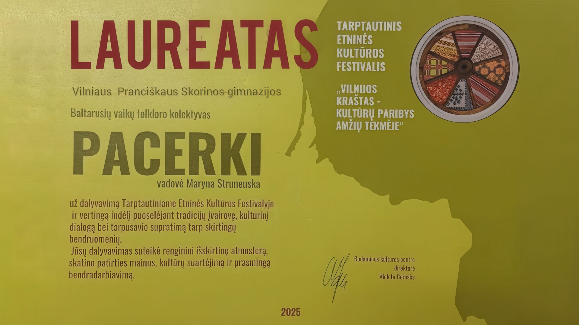 Lapkričio 28 d. Vilniaus Pranciškaus Skorinos gimnazijos mokiniai kartu su folkloro kolektyvu „Pacerki“ („Karoliukai“) dalyvavo tarptautiniame etninės kultūros festivalyje „Vilnijos kraštas – kultūrų paribys amžių tėkmėje“, kuris vyko Rudaminos kultūros centre. Jaunieji artistai atliko baltarusių liaudies dainas, šokius, perteikė baltarusių liaudies tradicijas, kurios gyvuoja ir šiandien. Dėkojame vaikams, vadovams ir tėvams už darbą, kūrybiškumą ir meilę baltarusių tautos paveldui.